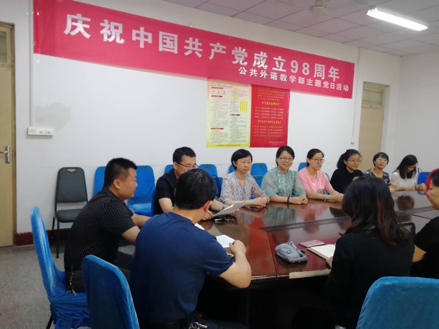 曲阜校区党支部召开主题党日活动,庆祝中国共产党成立98周年,党日活动由支部书记王广成主持,全体党员参加。会上,王广成带领全体与会党员重温了入党誓词,全体党员认真学习领会了习近平总书记“不忘初心、牢记使命”的理论内涵和实践要求,进一步明确了“守初心、担使命,找差距、抓落实”的总体要求。全体党员面对国旗、党旗,庄严宣誓,重温入党誓词,永葆入党初心。同时,支部副书记刘成干结合实际,围绕“不忘初心、牢记使命”主题带头讲授了党课,要求全体党员、全体教师要坚决维护核心,对党忠诚,聚焦贯彻落实以习近平同志为核心的党中央的各项决策部署和精神,为促进学校大学英语改革发展而担当有为。其次,围绕本次民主生活会,党员同志就发扬民主、教学促进等进行了热烈的讨论。