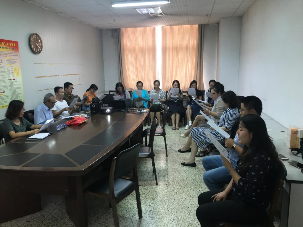 会议共分四个环节。第一个环节是许汝民教授讲话并教唱红歌。许教授堪称外国语学院的元老,虽已退休多年,但初心不改,始终保持对学校和专业发展的高度关注。他用流利的英语对学校的整体实力以及外语学科的发展给予了非常积极的评价,老师们深受鼓舞。他勉励老师们要不断提升自我,从而更好地教书育人。他希望老师们能够孝亲敬老,弘扬中华民族的优良传统,还要处理好家庭关系,做到夫妻和睦。许教授流畅标准的英语让老师们折服。他的谆谆教导和殷切希望,让老师们感受到了老前辈对年轻一代的关爱。他的讲话博得了老师们热烈的掌声。接下来许教授开始教唱歌曲《强军战歌》以及《不忘初心》 “听吧,新征程号角吹响,强军目标召唤在前方,国要强我们就要担当……”“不忘初心,继续前进,万水千山最美中国道路……”老师们在许教授的带领下唱出了心声、唱出了情怀、也唱出了老一代前辈对党和国家的希望。会后,老师们纷纷表示,许教授过去为我校外语学科做出卓越的贡献,退休后依然心系外语学科发展,关心每一位老师的成长与进步;他们纷纷表示一定牢记许教授嘱托,做好本职工作,努力提升自我业务水平,为学校的发展和学科的强大贡献力量。支部书记杜庆凤也对许教授对外语部日照党支部工作的关注和支持表示诚挚的谢意,对许教授的学术追求以及他对年轻教师的关爱表示钦佩和敬意,希望党员教师们多向许教授学习,提高业务能力和个人素养。