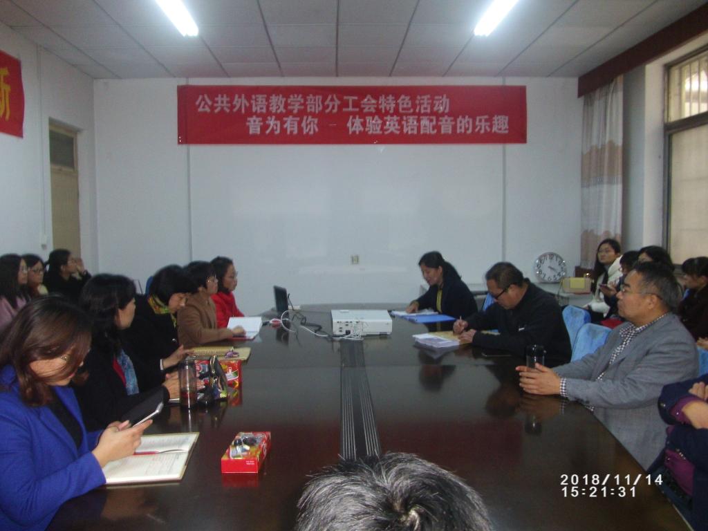 11月14日下午三点,特色活动在会议室正式举行。汪娟老师就配音软件《英语趣配音》、郑桂玲老师就配音软件《配音秀》分别进行了细致介绍;仲蕾老师就配音软件的时长要求、参赛要求进行了补充介绍。老师们提前下载了配音软件,并跟随讲解步骤操作实践,表现出了浓厚的兴趣。