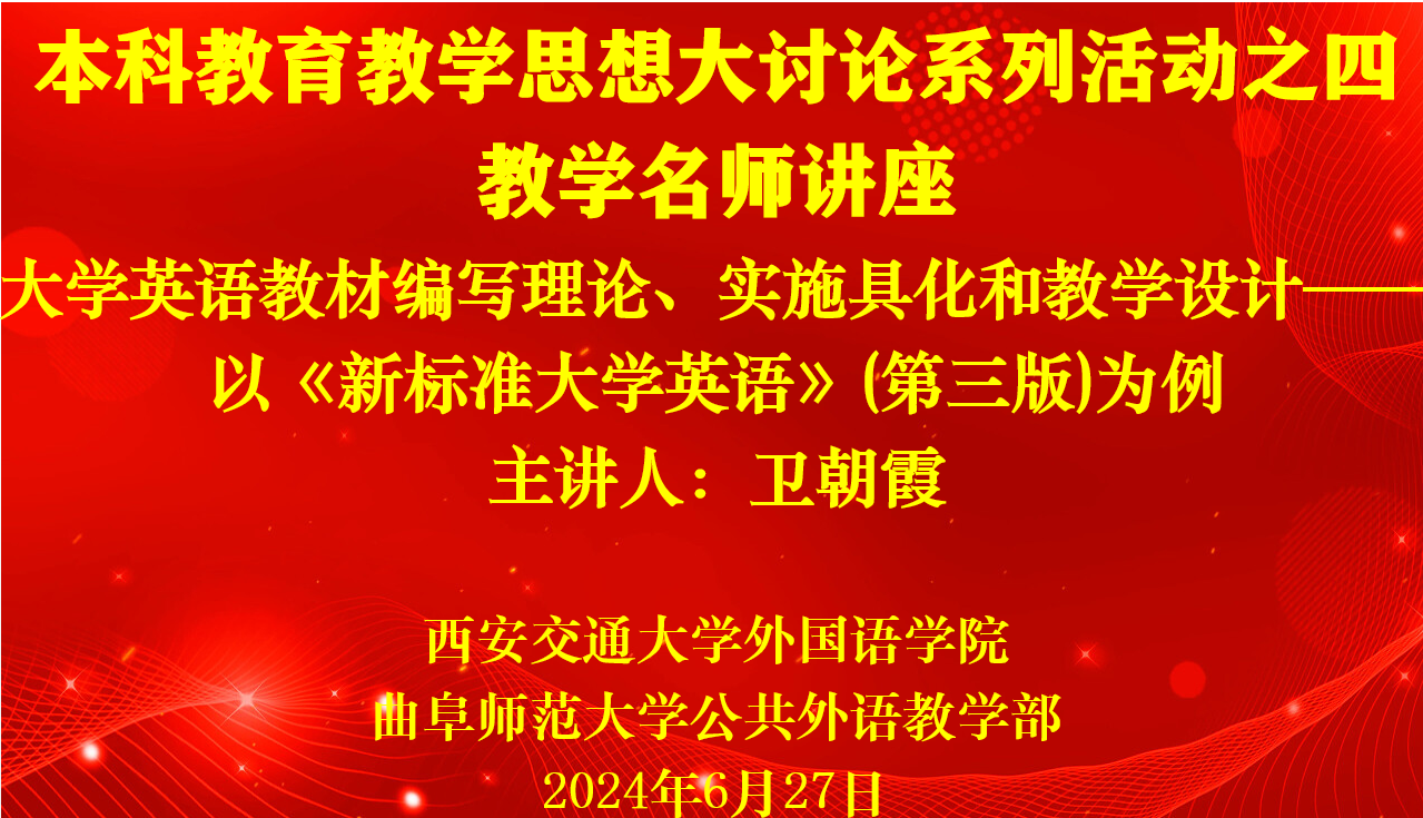 举办本科教育教学思想大讨论系列活动之四:教学名师讲座,特别邀请西安交通大学外国语学院卫朝霞副教授作题为“大学英语教材编写理论、实施具化和教学设计——以《新标准大学英语》(第三版)为例”的专题报告。活动由斗地主