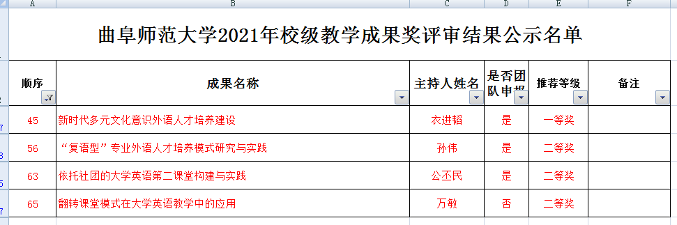 按照山东省教育厅和我校《关于开展2021年校级高等教育教学成果奖评选工作的通知》要求,我校组织了2021年校级教学成果奖评审,经个人申报、学院排序推荐、学校资格审核、初审和专家终审等环节,共评定教学成果奖特等奖22项、一等奖23项、二等奖23项。其中我部衣进韬老师获得一等奖,孙伟老师、公丕民老师、万敏老师获得二等奖。