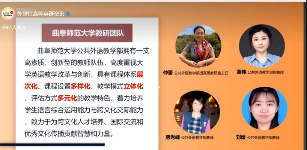 团队成员老师通力合作,共同打磨,精心准备。从语言、能力、素养三个方面明确本单元教学目标,结合学生实际,清晰合理地安排教学内容,各环节衔接自然,有教有评,并通过润物细无声的方式融入中国传统文化等思政内容。仲蕾老师代表我部教研团队向广大教师介绍了具体设计思路和教学安排。在问答环节中,仲老师回答了关于小组活动的开展以及课程思政相关的问题,与广大院校分享了曲师大经验。