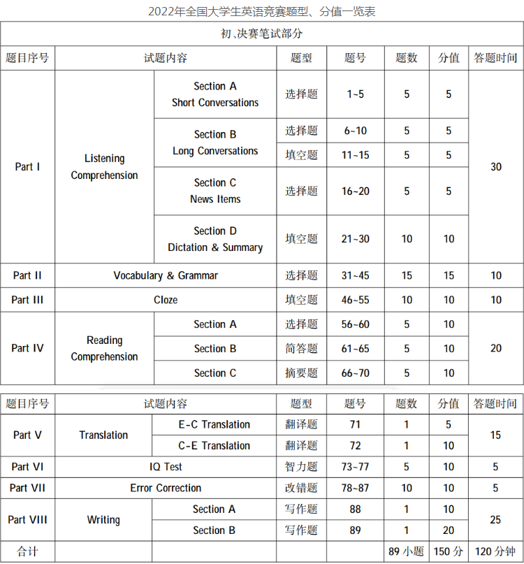 【竞赛介绍】2022年全国大学生英语竞赛题型、分值一览表