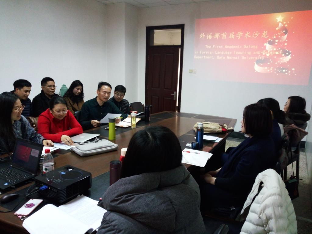 在首场活动中,曹敬美、龙磊、董伟、吴涛和门超元等5位老师分别做了精彩的专题报告。老师们结合自身研究领域相关学术前沿状况,提出研究课题,并对其研究内容做了深入浅出的介绍与分析。其中,曹敬美副教授以“非言语行为研究:用‘脚’说话”为题,借助实际教学案例,运用非言语行为理论对加强英语听力课堂教学和管理方面起到的积极作用这一课题提出自己的观点;龙磊博士的报告题目是“回环否定构式及其语义构建”,他分析了语用学与认知语言学对回环否定构式解释的互补性,并指出将两种不同理论融合起来可以更好地解释相关语言现象;门超元老师以“西方媒体视野下的孔子形象——基于语料库的批评话语分析视角”为题,运用语料库分析手段,以西方媒体中有关孔子的新闻语篇为研究对象,探索西方媒体以何种话语策略构建了何种孔子形象这一课题;吴涛老师在“反拨效应的具体性研究框架建构---以CET翻译题型改革为例”一文中对国内外反拨效应理论的研究进行了梳理,探讨CET题型调整对大学英语课堂教学产生的反拨效应;董伟副教授探讨了大学英语教学与跨文化交际能力培养的关系,提出构建多层次、多类别、个性化的大学英语课程体系的课题研究思路。上述精彩报告赢得在座老师们的高度赞誉与热情反馈,老师们针对不同的研究成果与课题思路,积极发表自己的看法、质疑以及建议,活动现场学术氛围浓厚、气氛热烈。
