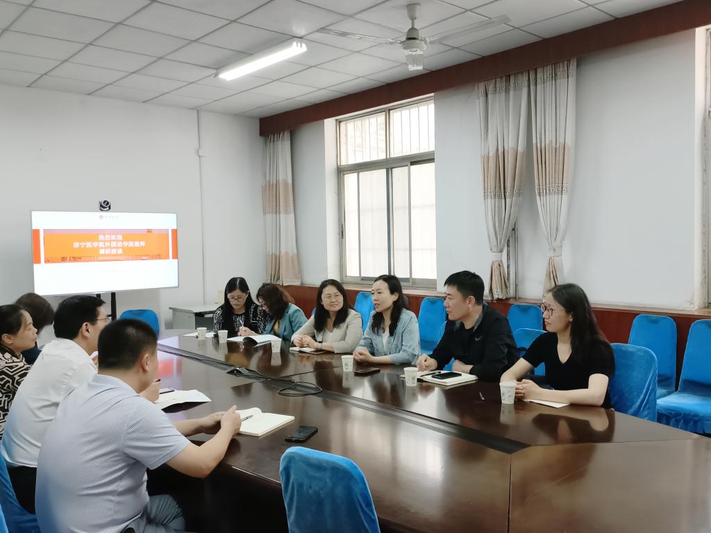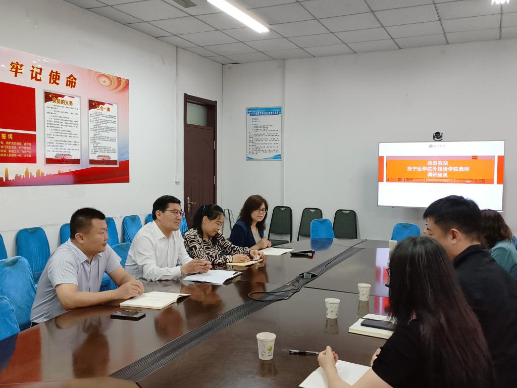 对其到访交流的支持和帮助,介绍了济宁医学院外国语学院大学英语教学现状及改革情况。作为医学类专业院校,朱敏就大学英语教学的ESP课程建设、专业英语教学等方面进行了深入交流。副书记史飞及副院长褚宏蕊分别就主题教育、大学英语教学、科研及党建工作进行经验分享与交流。随同老师在教学比赛、学生管理及外籍教师聘用等工作进行了深入探讨。朱敏一行表示希望通过此次交流,进一步密切两院往来、深化协作,共同提高办学水平。